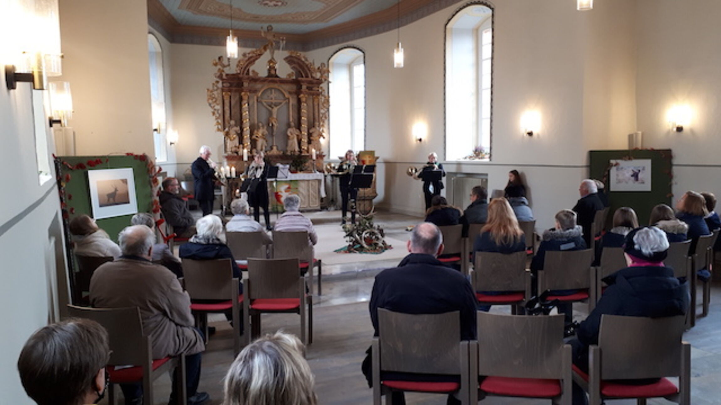 Das Ensemble „Naturhorn En Aval“ spielte historische und neue jagdliche Hornmusik aus Frankreich, Deutschland und Österreich. Neben Gedichten, Anekdoten und Jägerlatein sorgten Naturfotografien von Hubertus von Blum für einen stimmungsvollen Rahmen.